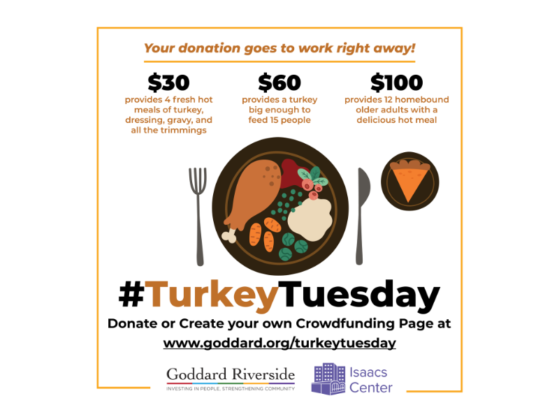 Join Goddard Riverside for a festive meal at our Older Adult Community Center (593 Columbus Ave)! Our dining room will be open from noon until 3 PM on Thanksgiving Day, Thursday, November 27th. Everyone who would like a meal is welcome; there is a one meal per person limit.