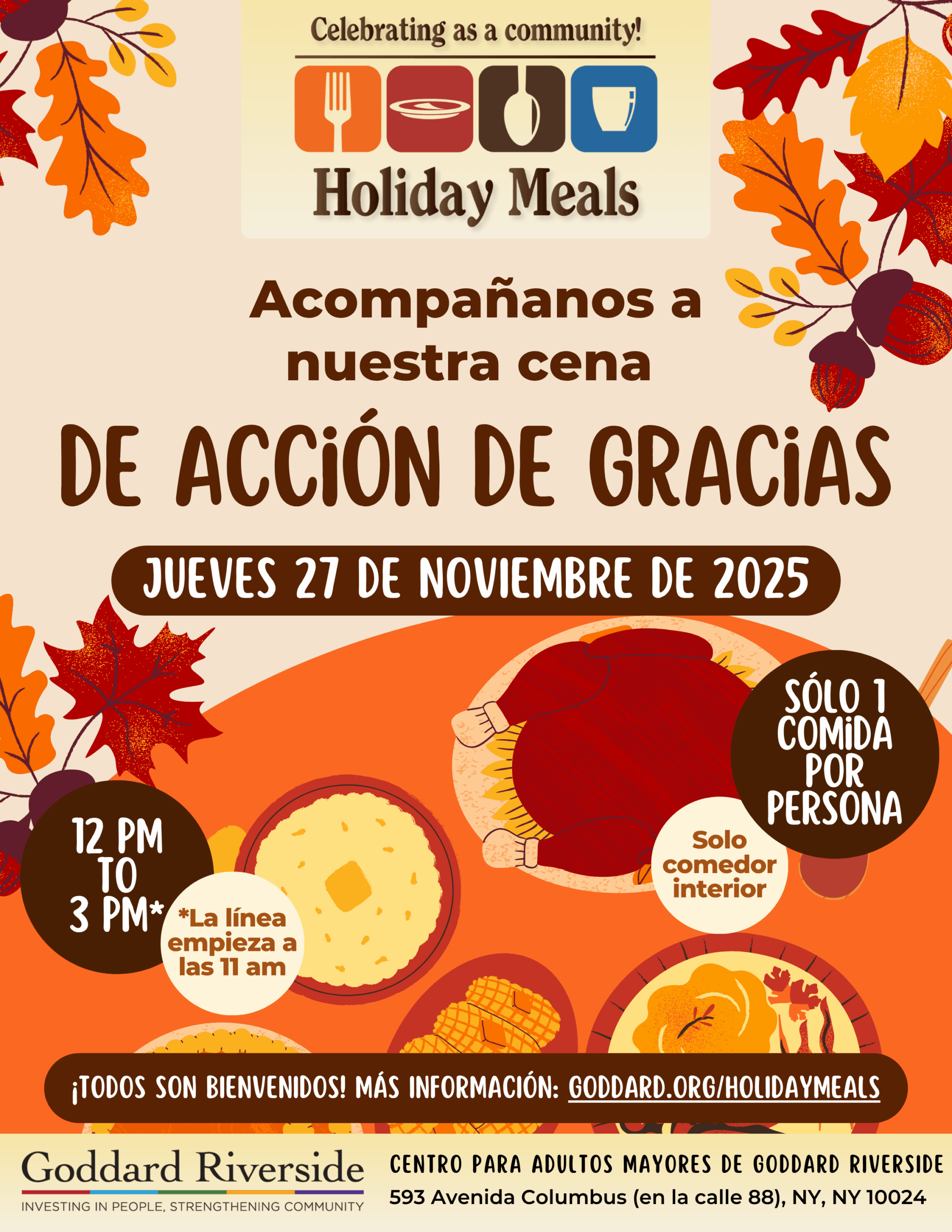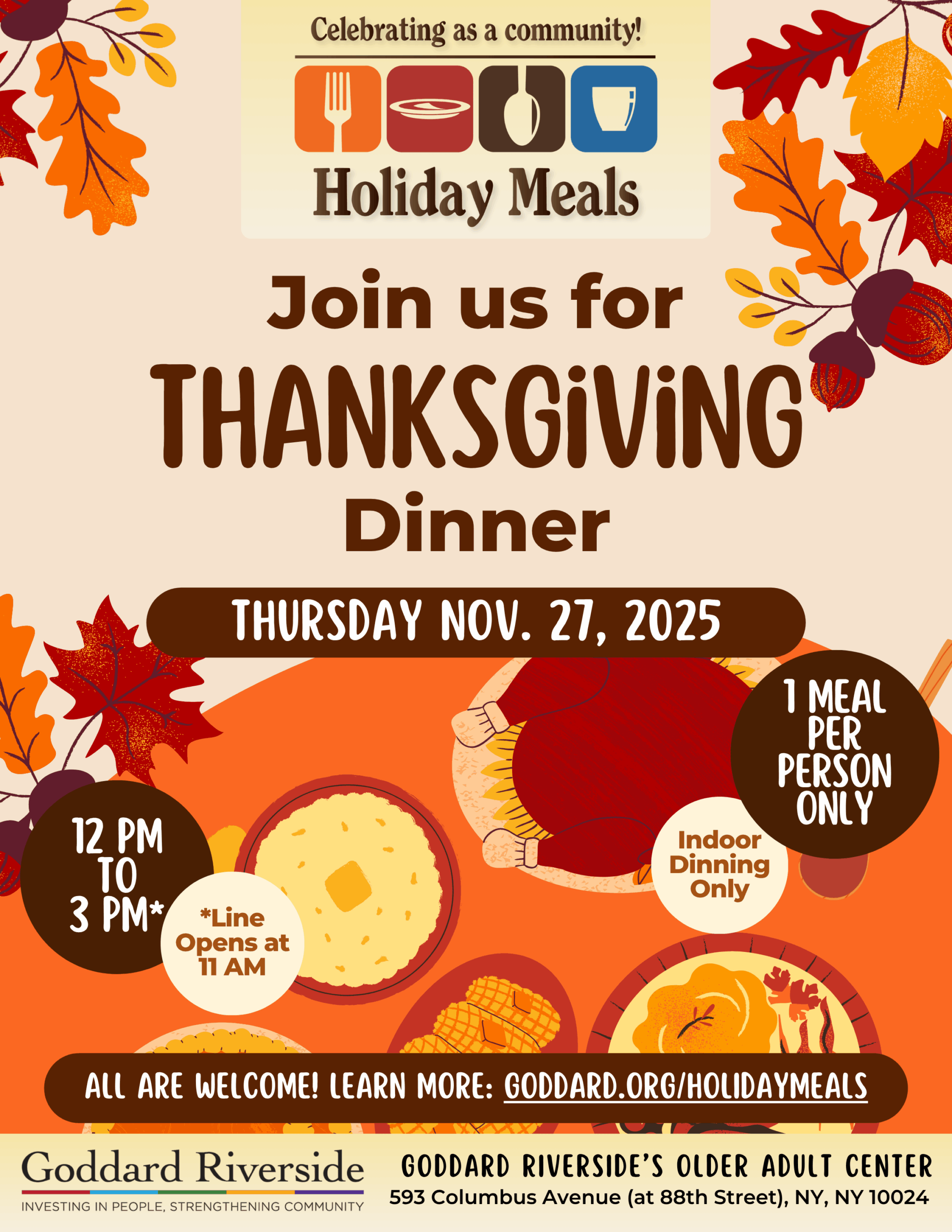 Join Goddard Riverside for a festive meal at our Older Adult Community Center (593 Columbus Ave)! Our dining room will be open from noon until 3 PM on Thanksgiving Day, Thursday, November 27th. Everyone who would like a meal is welcome; there is a one meal per person limit.