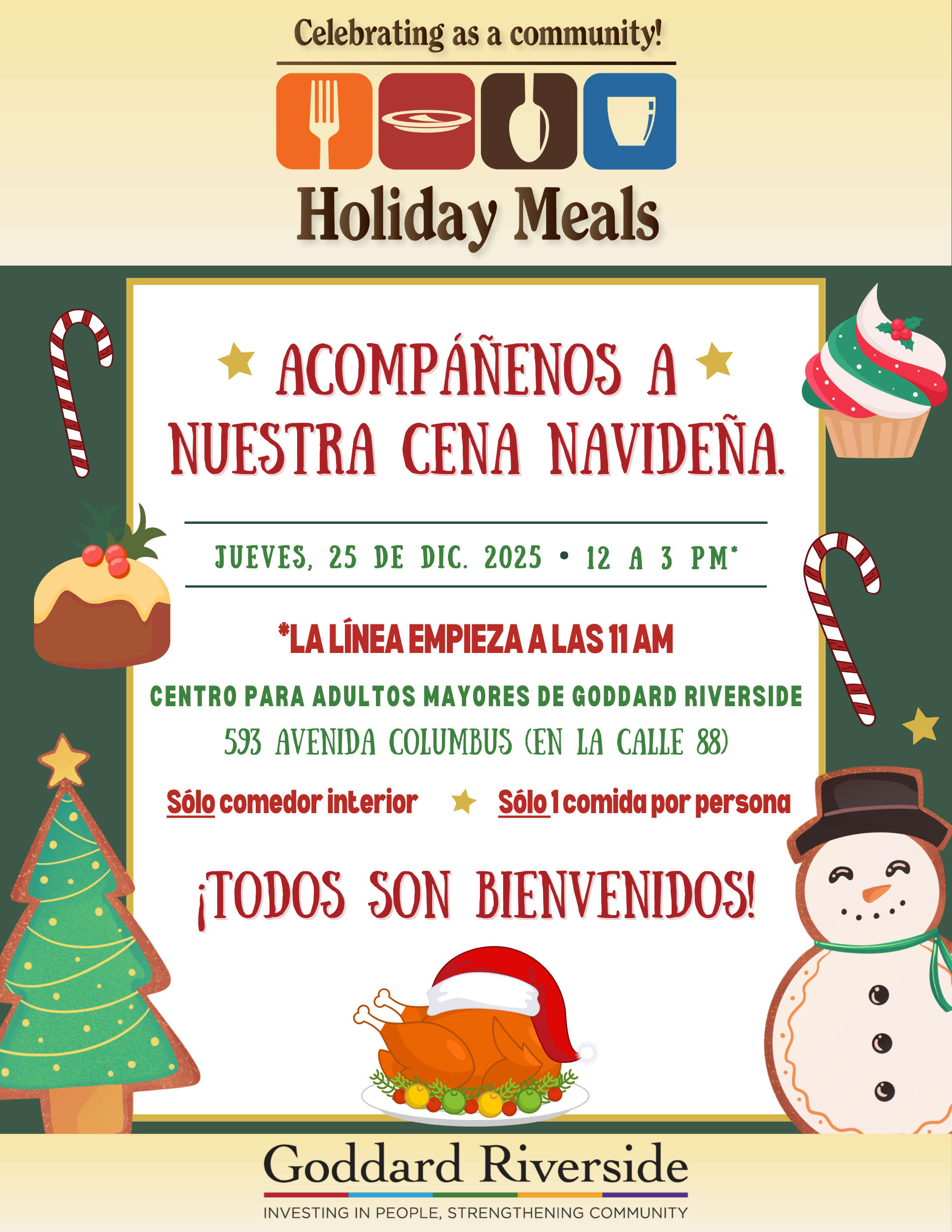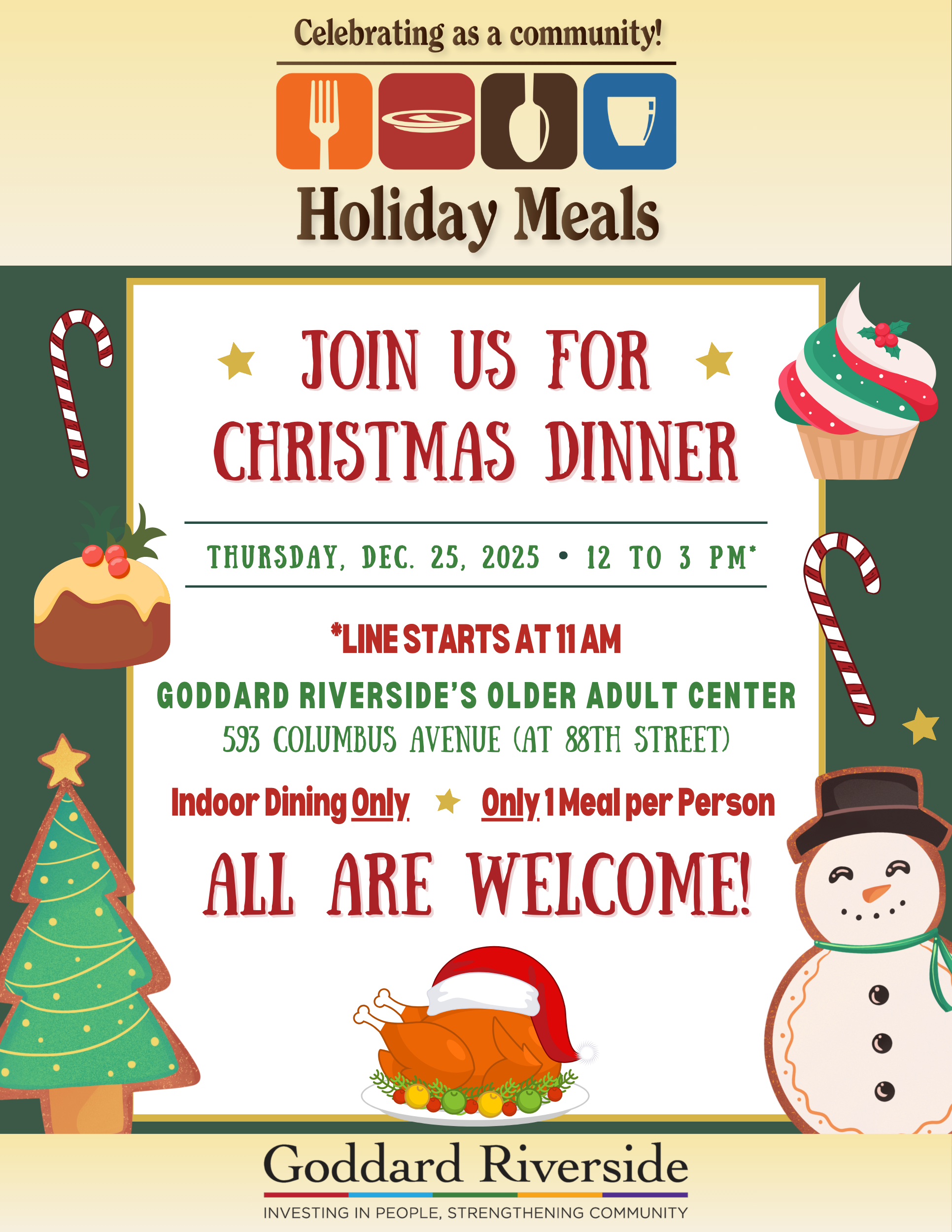Join Goddard Riverside for a festive meal at our Older Adult Community Center (593 Columbus Ave)! Our dining room will be open from noon until 3 PM on Christmas Day, Thursday, December 25th. Everyone who would like a meal is welcome; there is a one meal per person limit.