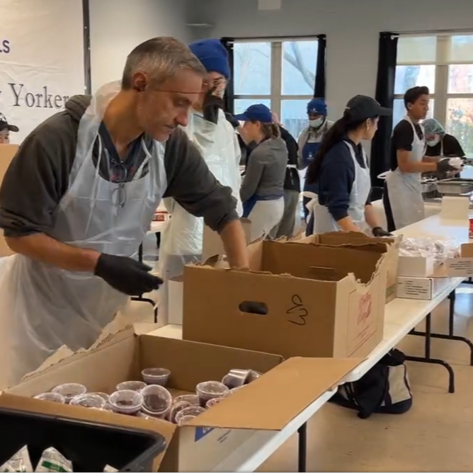 As he headed to 85th street to drop off the food, more bag-laden volunteers emerged from the center. Inside, dozens of people assembled the boxed meals in a careful choreography, then stacked them on carts to be rolled into the next room and assigned addresses for delivery.